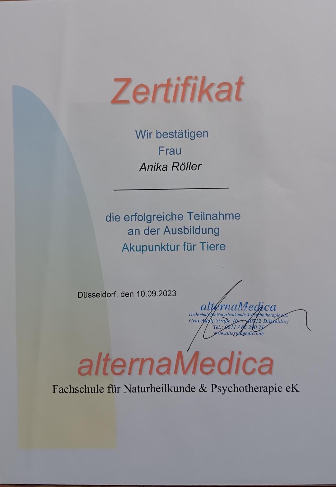 •2023 Akupunktur bei der alternaMedica Fachschule für Naturheilkunde &Psychotherapie eK in Düsseldorf